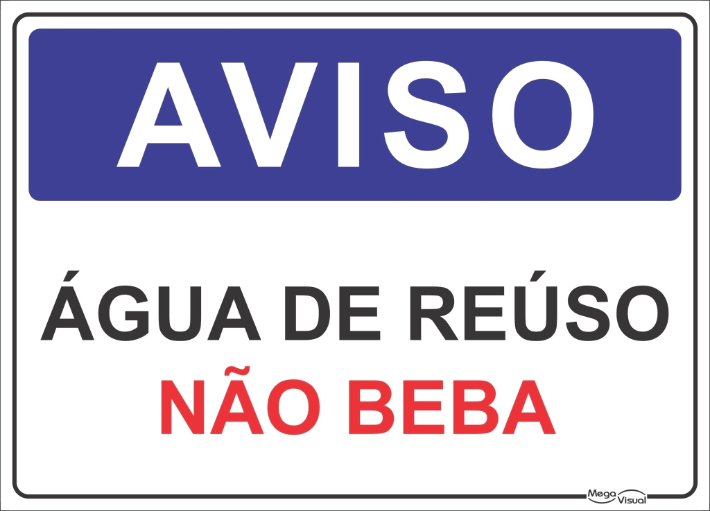 A placa "AVISO: ÁGUA DE REÚSO, NÃO BEBA" é indicada para sinalização de risco direto ou indireto e está de acordo com as NR26 e NR18.